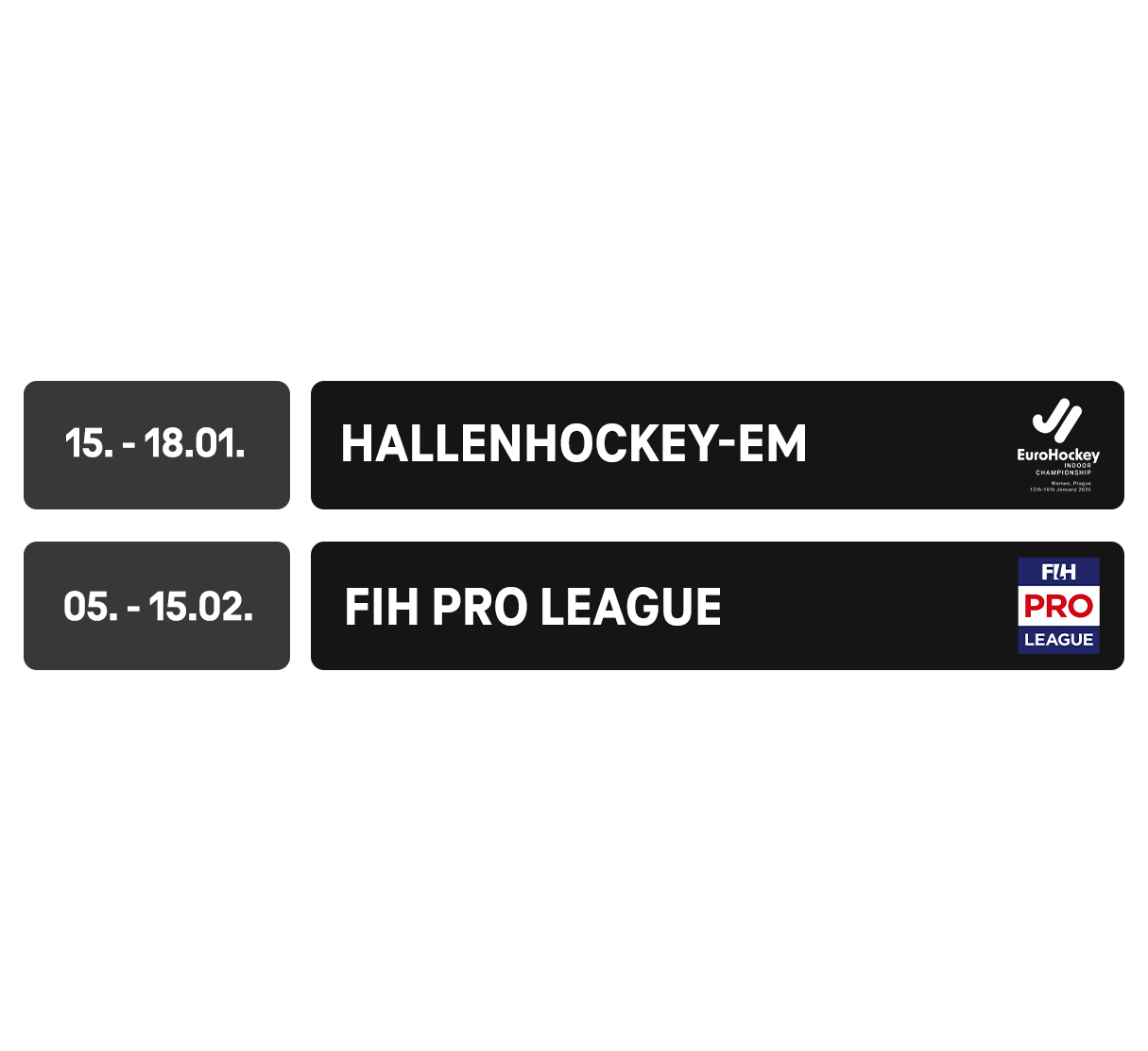 Im Jahr 2026 erwartet dich die Hallenhockey-EM, DEL-Wintergame, Rückrundenstarts der 3. Liga und Frauen-Bundesliga, FIH Pro League, CHL-Finale, DEL-Playoffs, DBB WM-Quali der Herren und Frauen, EuroCup und EuroLeague Playoffs, sowie das Final Four und vieles mehr!
