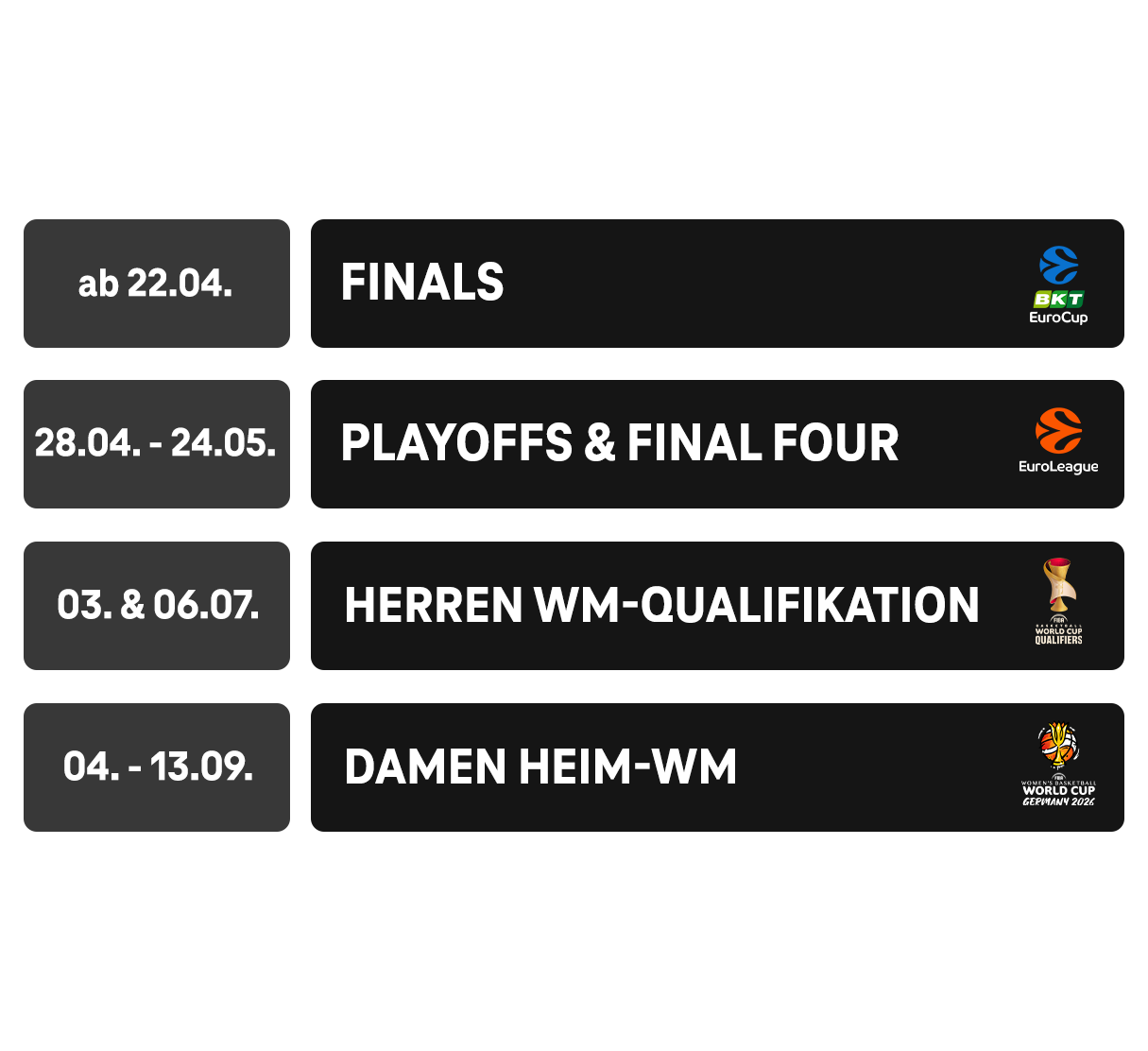 Im Basketball erwarten dich die EuroCup Finals und Ende April geht die EuroLeague mit den Playoffs und dem Final Four in die heiße Phase der Saison. Anfang Juli spielen die Herren um die WM-Qualifikation. Im September steigt die Heim-WM der Damen in Berlin.