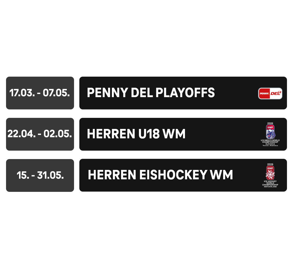 Die PENNY DEL mit den Playoffs geht in die heißeste Phase der Saison. Zudem startet Ende April die U18 Eishockey WM und im Mai die Herren Eishockey WM in der Schweiz.